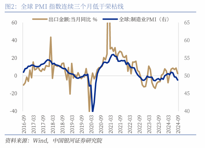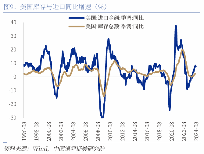 一是海外经济景气度回落以及美国主动补库偏弱,未来外需或延续趋弱。全球制造业PMI自7月以来连续三个月下行,且9月下行速度加快,全球经济景气度延续下行或将对出口带来持续拖累。此外,7月美国库存总额同比增速2.5%,已连续8个月上升,美国本轮补库虽然已经渡过底部,但回升仍受高利率压制。9月美国失业率回落至4.1%,CPI同比增速降至2.4%,劳动力和通胀数据进一步加强了“软着陆+预防性降息”的预期,高利率压制美国主动补库动能上行,其对进口需求的支撑或将有限。