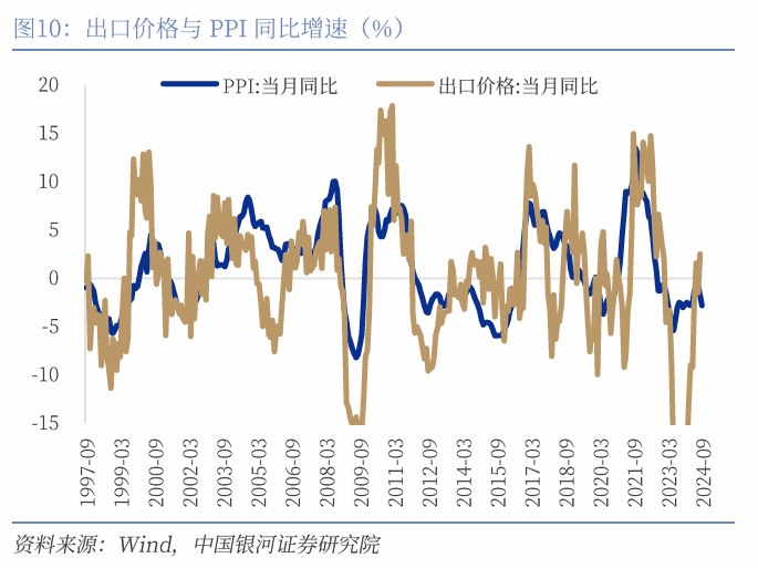 · 9月份出口增速有所回落,源于外需放缓、价格拖累以及前期抢出口效应的透支:一是外需放缓对出口支撑减弱。9月全球PMI指数降至48.8%(前值49.6%),连续三个月低于荣枯线,其中美欧英日韩、印俄墨等经济体PMI均延续回落。9月韩国出口增速7.5%(前值11.4%),越南出口同比增速8.4%(前值16.1%),韩越两国出口增速亦纷纷下行,均指向外需趋弱对出口支撑减弱。二是价格因素对出口继续形成拖累。9月我国制造业PMI出厂价格指数44%(前值42%),边际修复但仍处低位。此外根据海关总署贸易统计快讯计算单价的17个品类中,2023年单价下降的品类有14类,今年前八个月,除中成药、集成电路和船舶外,其余商品出口单价同比延续下降。三是前期企业抢出口行为对出口的透支效应显现。二季度以来受多国关税贸易摩擦、红海冲突对供应链持续影响以及美东海岸与和墨西哥湾沿岸港口工人潜在的罢工风险等因素影响,企业提前出货带来抢出口效应,近期随着美欧加征关税和美东大罢工事件接连落地,国外进口商提前备货意愿趋弱,前期抢出口对出口的透支效应逐步显现。此外,9月有多个台风影响我国沿海地区,亦对出口带来一定扰动。