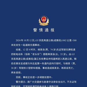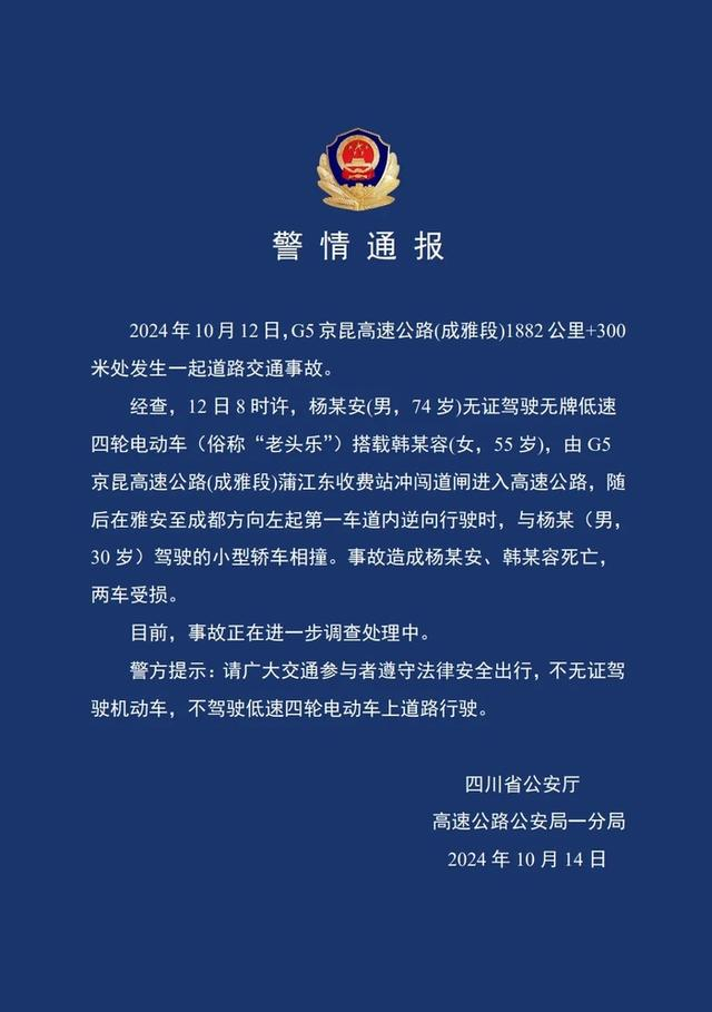 “老头乐”冲卡在四川成雅高速逆行被撞飞致2人死亡,警方通报