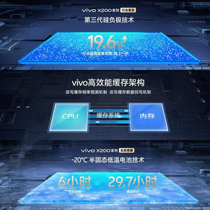 首先是蓝海续航系统。vivo X200 全系配备 -20°C 半固态低温电池技术,率先应用第三代硅负极技术,拥有行业最高循环寿命。同时,搭配全新高效能缓存架构,升级缓存系统频率带宽预测机制,为用户带来卓越的功耗优化体验,在多种场景下均可实现两位数的功耗降低。