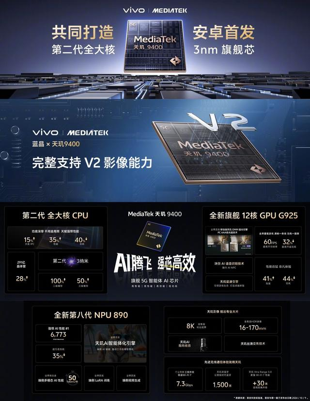 蓝晶领域带来安卓首个 3nm 移动 SoC——第二代全大核处理器天玑 9400。它支持 V2 影像芯片的所有能力,vivo 还与 Arm 成立联合实验室,涉足芯片供应链最上游。Arm 与联发科高管分别登台讲解 X925 微架构与天玑 9400 的技术细节。其单核性能提升 35%,多核提升 28%,功耗降低 40%,GPU 性能提升 41%,功耗降低 44%,更是行业首发暗区突围全地图 90 帧光线追踪技术。