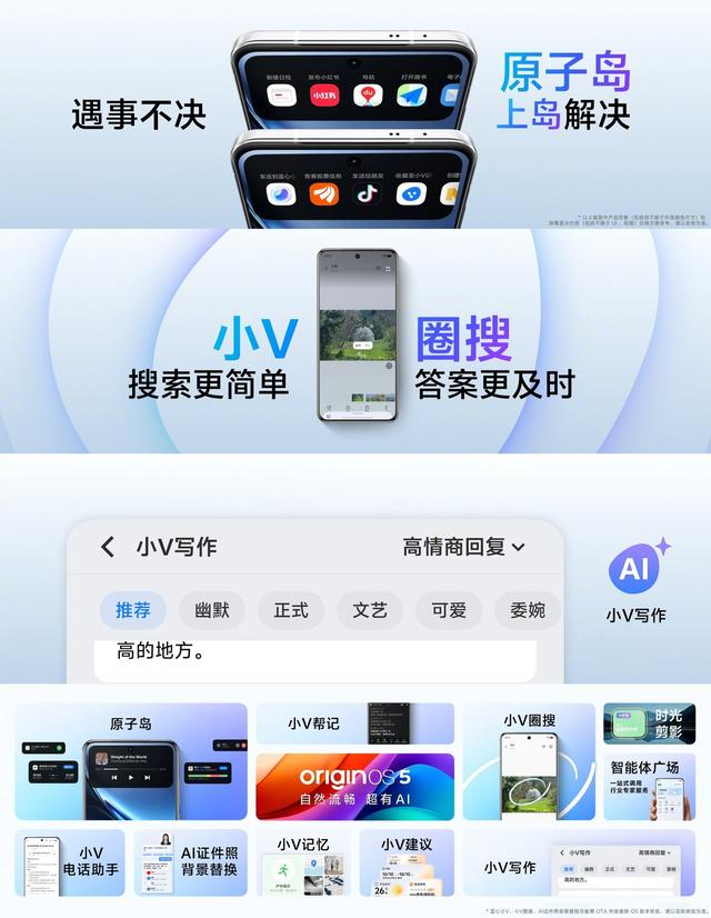 OriginOS 5 带来全新的原子岛,支持拖拽直接分享与购买同款,可根据拖拽内容自主判断用户意图,主动提供匹配的功能入口。全新小 V 圈搜,支持一圈即搜;还有全新小 V 写作。