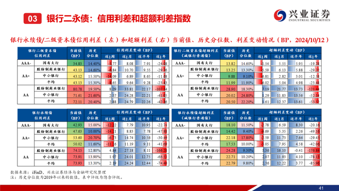 考虑到利差中枢可能系统性下移,截至2024年10月9日,3年期AAA-级二级资本债信用利差一度走阔到52BP上下,可能已经到达理论意义上的阶段性高点。当前(截至2024年10月12日)3年期AAA-级二级资本债信用利差已回落至38BP,性价比有所下降但仍处相对高位。