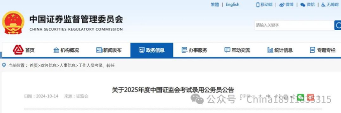 关于2025年度中国证监会考试录用公务员公告