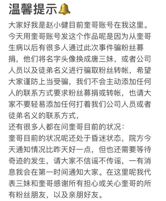 10月9日,“云南阿奎”账号曾发布消息称,自从阿奎生病后,很多人通过此次事件骗粉丝募捐,提醒大家谨防上当受骗。