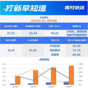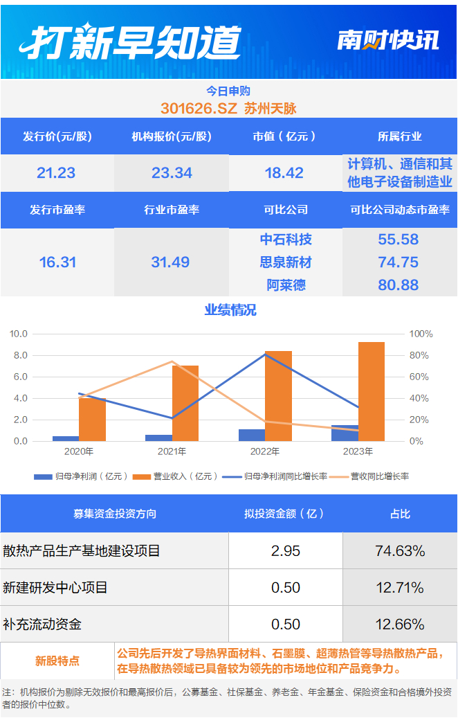 10月15日,可申购创业板上市的苏州天脉(301626.SZ),该公司是一家致力于为电子行业客户提供导热散热产品和热管理整体解决方案的高新技术企业。