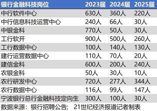 记者注意到,多家银行的软开、数据中心、科技子公司等科技板块已经连续两年缩招。