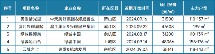 表:2024年9月杭州典型新房项目