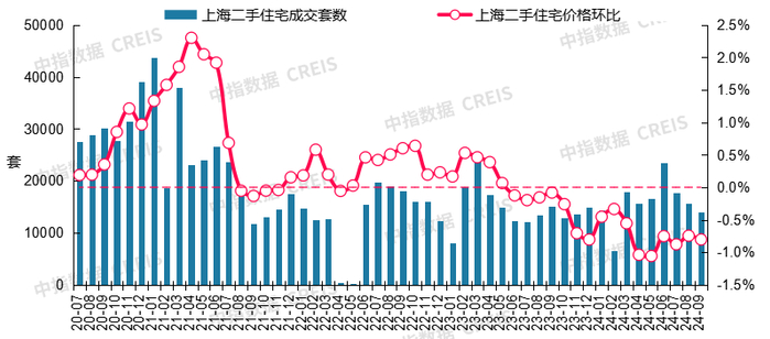 图:2020年7月至2024年9月上海二手住宅成交套数及二手住宅价格环比走势
