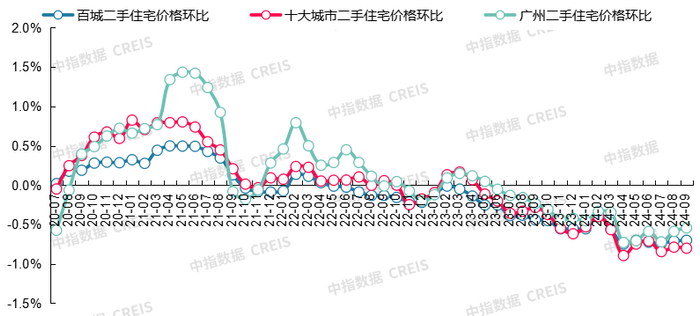 图:2020年7月至2024年9月百城、十大城市及广州二手住宅价格环比走势对比