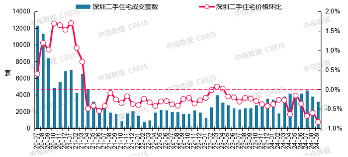 图:2020年7月至2024年9月深圳二手住宅成交套数及二手住宅价格环比走势