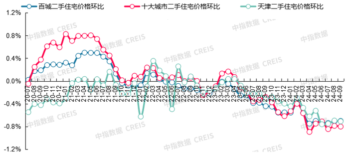 图:2020年7月至2024年9月百城、十大城市及天津二手住宅价格环比走势对比