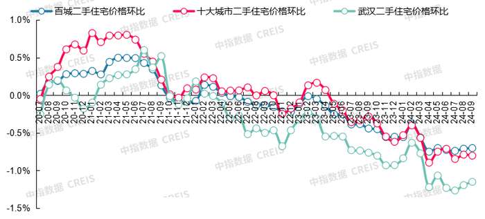 图:2020年7月至2024年9月百城、十大城市及武汉二手住宅价格环比走势对比