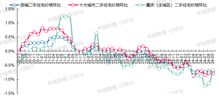 图:2020年7月至2024年9月百城、十大城市及重庆二手住宅价格环比走势对比
