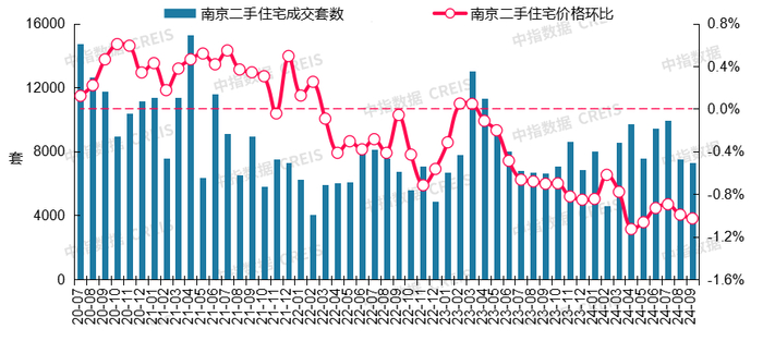 图:2020年7月至2024年9月南京二手住宅成交套数及二手住宅价格环比走势