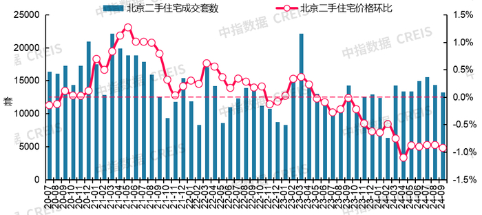 图:2020年7月至2024年9月北京二手住宅成交套数及二手住宅价格环比走势