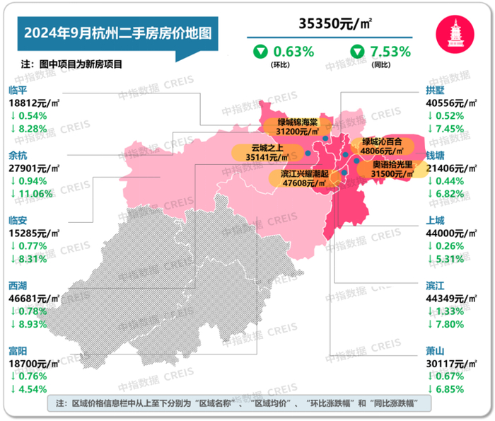 图:2024年9月杭州各市辖区二手住宅挂牌均价及环同比
