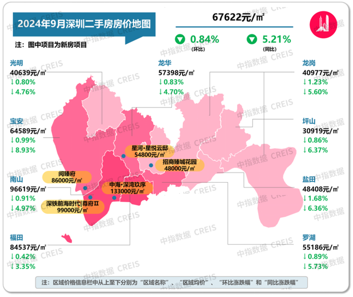 图:2024年9月深圳各市辖区二手住宅挂牌均价及环同比