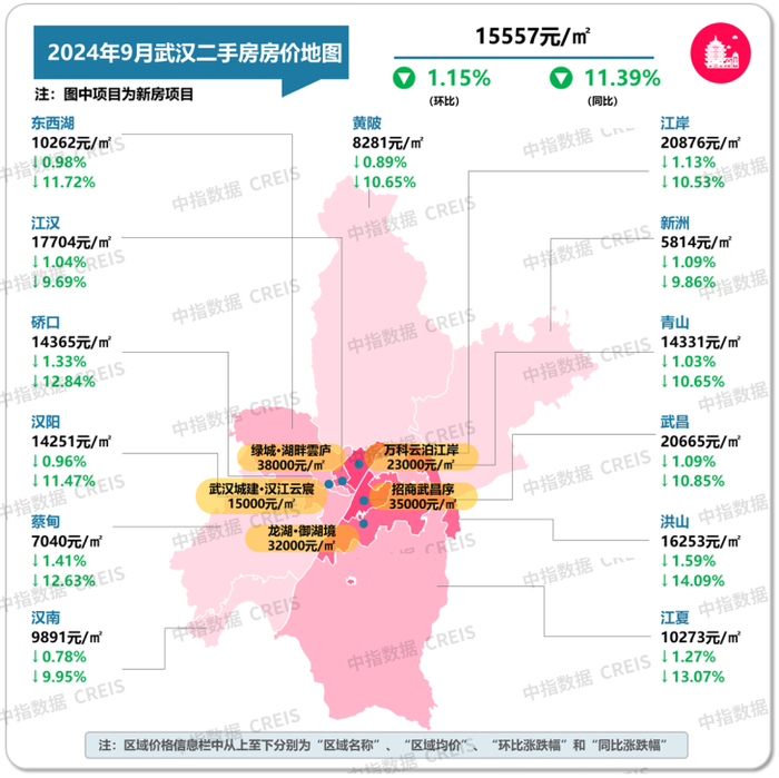 图:2024年9月武汉各市辖区二手住宅挂牌均价及环同比