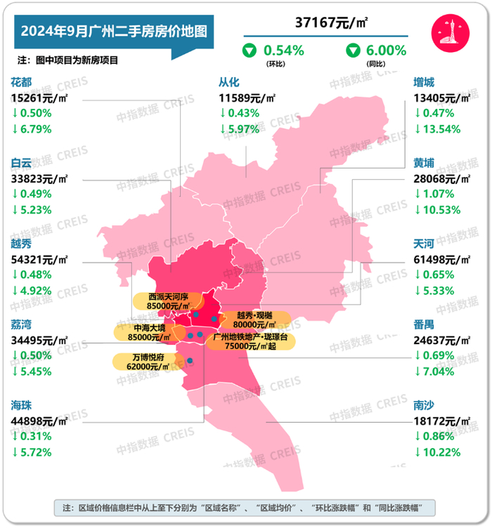 图:2024年9月广州各市辖区二手住宅挂牌均价及环同比