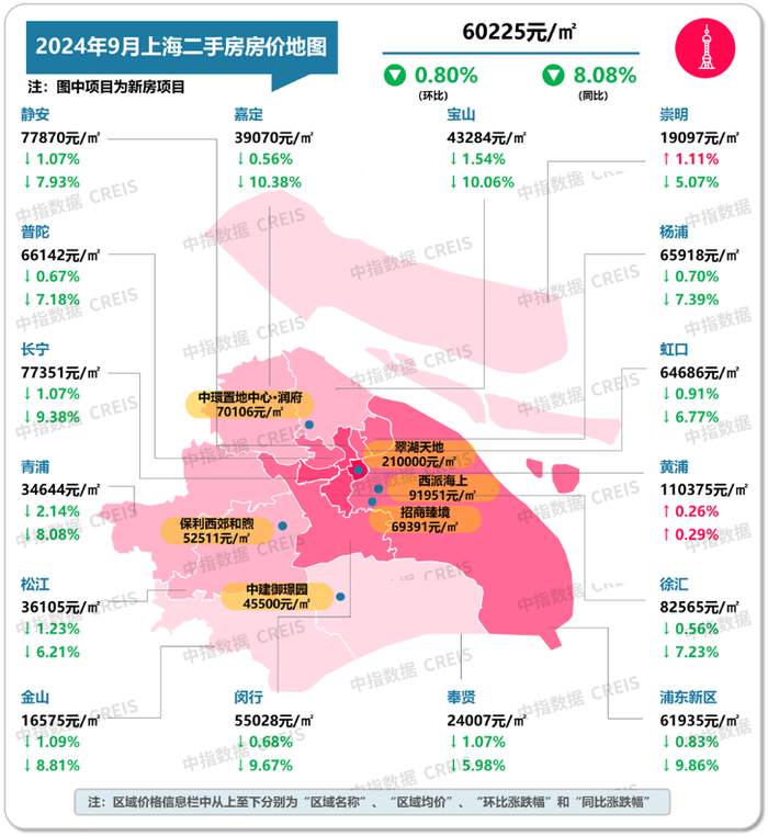 图:2024年9月上海各市辖区二手住宅挂牌均价及环同比