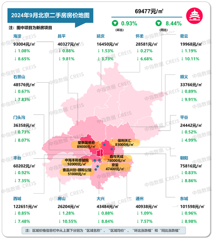 图:2024年9月北京各市辖区二手住宅挂牌均价及环同比