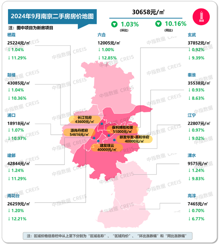 图:2024年9月南京各市辖区二手住宅挂牌均价及环同比