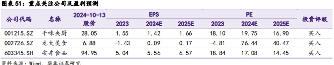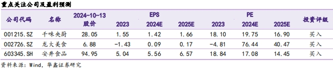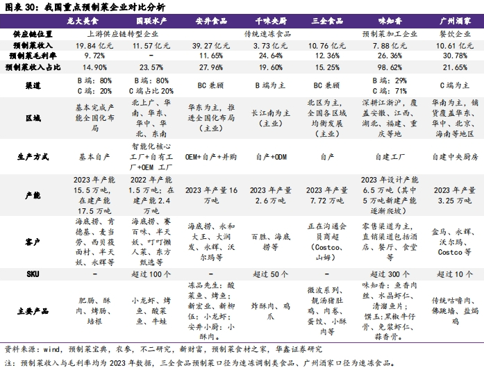 考虑规模、渠道、供应链三个维度,我们选取安井食品、千味央厨、龙大美食作为重点企业分析。1)安井食品:作为国内速冻龙头,公司2021年提出“三路并进”战略,通过自产(安井小厨)+贴牌(冻品先生)+外延并购(新宏业+新柳伍)布局预制菜业务,公司渠道推力强,预制菜板块2018-2023年营收CAGR为58%,随着产能自供率提升,盈利空间持续打开。2)千味央厨:公司为B端提供速冻品解决方案起家,客户资源与研发优势明显,由于绑定百胜、海底捞等核心大客户,叠加大单品蒸煎饺放量,2018-2023年预制菜板块营收CAGR高达97%。3)龙大美食:公司为国内肉类加工龙头企业,2021年确立“一体两翼”发展战略,即以食品为主体,以养殖和屠宰为两翼支撑,实现预制菜产品性价比优于市场,预制菜业务自2021-2023年营收CAGR为30%,全国化产能布局为预制菜业务扩张奠定基础。