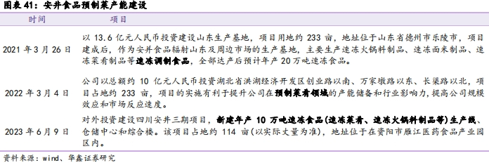 全国化生产基地布局,预制菜自产率持续提升。在“销地产”战略布局引导下,安井食品已在全国范围内建立12座工厂,形成以华东为核心,辐射全国的生产基地布局,其中洪湖安井、山东安井、四川安井包含预制菜生产项目,洪湖安井基地推进建设,山东安井一期2024年逐步投产,四川安井三期10万吨预制菜与速冻火锅料生产线也于2024年3月正式开工,随着产能逐步投产,预制菜板块产能自供率将逐步提升,打开后续盈利空间。