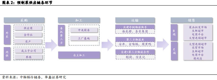 新规对预制菜供应链升级提出更加严苛的要求,冷链建设成为行业扩容基础。预制菜供应链可分为采购、加工、运输和销售四个环节,行业内公司通过各个环节切入预制菜赛道。