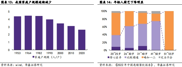 C端主要驱动因素为家庭规模缩小及年轻消费者烹饪技能的掌握不足。随着结婚成本、生育养育成本上升,单身潮、家庭小型化趋势愈加明显,根据全国人口普查主要数据显示,我国家庭户规模从1953年的每户4.36人逐年下降至2020年的每户2.62人。加之疫情催化下,“宅家文化”和“懒人效应”成为潮流,根据《2022年中国连锁餐饮报告》数据显示,超过半数的消费者认为自己难以胜任烹饪任务,这一问题在年轻一代中尤为明显,越来越多的消费者选择购买预制菜在家烹饪这种省时省力的饮食方式。