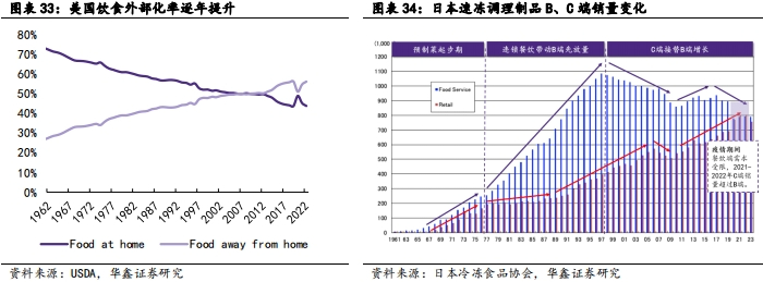 日本先B后C:二战后日本逐步构建速冻食品工业体系,团餐业逐步导入速冻食品,1970年快餐兴起,B端先于C端放量,1990年后,日本人口老龄化问题凸显,经济泡沫破裂导致餐饮业下行,叠加女性就业率提升与家庭小型化,C端预制菜消费稳步提升。疫情期间餐饮消费受到抑制,2021-2022年C端速冻品消费量首次超过B端,目前销量端B:C接近五五开。