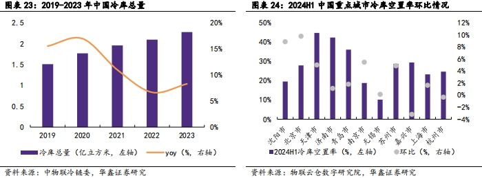 速冻菜肴收割含防腐剂料理包份额将催化冷链运输需求增长,预计中期冷库容量仍可承接预制菜增量运输需求。疫情后期,我国冷链市场整体处于承压前行、需求企稳回升的震荡格局,但冷库总量与冷链市场规模整体处于稳步增长过程中,需求端来看,新规下预计C端速冻菜肴将替代部分常温料理包份额,推升冷链运输需求稳步回升;供给端来看,2024年我国冷库供应平稳增长,同时现有冷库空置率仍处高位,预计冷库增量与现有空置存量中期仍能承接新增预制菜运输需求,同时消费降级下冷库租金持续下降,速冻企业物流费用压力预计有所回落,随着物流设施完善,冷链规模端与成本端对预制菜运输的制约效应持续减弱,预制菜运输半径受限、品牌区域性问题将逐步缓解。