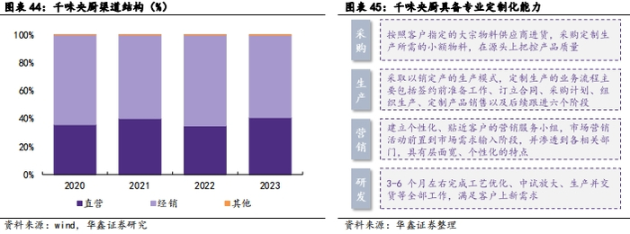 直营渠道方面:产品专业化定制,绑定核心大客户。千味央厨具备优秀的差异化定制能力,在营销、研发、采购、生产以及管理环节全方位把控,满足客户个性化需求,积累优质大客户,目前已成为肯德基、必胜客、华莱士、海底捞等知名餐饮品牌供应商,其中第一大客户为百胜,通过多年服务合作,目前公司已为百胜中国策略供应商(前1%),保障公司主要产品供应份额稳定且新品提案无品类限制,2023年来源于百胜中国的营收占总营收的21%,存量客户端打牢收入地基。