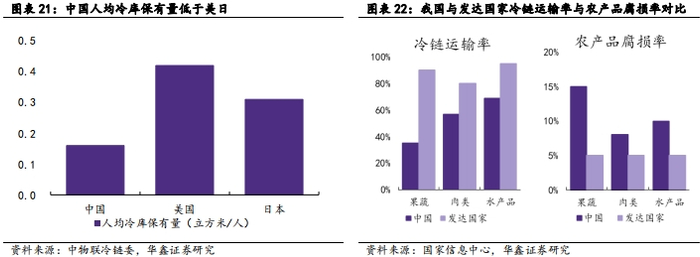 在生产/地理/消费习惯差异制约下,预计我国人均冷链规模仍低于发达国家。我国人均冷库保有量较低且生鲜冷链运输率较低,主要原因在于:1)上游:相较于美国农场大规模集中种植,我国生鲜农产品产地更为分散,同时相较于日本的多级批发市场长链条与美国的大型配送中心的短链条,我国流通环节同时存在美日两国链条方式,环节复杂,难以在物流端形成规模效应,边际成本较高。2)中游:冷链物流基础设施初期投资成本大,资源整合门槛较高,美日冷库投资运营模式成熟、资金充足,而中国尚缺少组织力强的投资主体和资金的投入。3)下游:我国人口密度较高,因此C端配送效率较高,而餐饮端连锁化率较低,因此B端冷链物流较发达国家仍较弱。在生产模式、地理分布于消费习惯制约下,预计我国人均冷库容量成熟期仍低于美日水平。