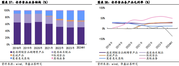 速冻龙头企业,三箭齐发打造预制菜第二增长曲线。安井食品为国内龙头速冻企业,2018年开始发力菜肴类业务,2021年公司提出“三路并进”战略布局,将预制菜肴提升至重要战略地位,自产(安井小厨)+贴牌(冻品先生)+外延并购(新宏业+新柳伍)三箭齐发,预制菜业务2018-2023年营收CAGR为58%,占总业务营收比例由2018年的9%提升至2024H1的29%,2024H1菜肴类业务营收达22.08亿元,成为公司第二增长曲线。在盈利方面,由于公司针对预制菜板块以B端做突破,在初期做快速放量,叠加部分采用OEM代工生产,因此板块毛利率相对低于主业,目前B端仍处于跑马圈地关键时期,公司顺应市场扩容持续做布局,随着行业政策门槛提高,公司有望逐渐建立竞争壁垒,同时自产比例上升,盈利能力将持续提升。