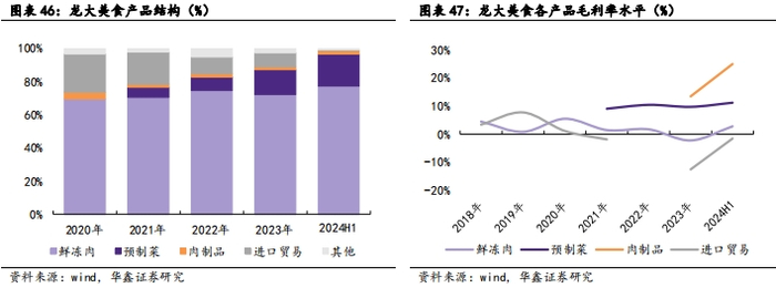 肉类加工龙头企业,确定以食品为主体的一体两翼战略。龙大美食前身为“烟台龙大肉类加工厂”,后续不断扩张业务、拓展客户,自2021年正式确立“一体两翼”发展战略,即以食品为主体,以养殖和屠宰为两翼支撑,其中食品业务(预制菜)分为食材类、半成品菜与成品菜,预制菜业务自2021-2023年营收CAGR为30%,占营收比例由2021年的6%提升至2024H1的19%,2024H1预制菜营收为9.73亿元。在盈利方面,预制菜作为肉制深度加工产品,毛利率显著高于主业鲜冻肉。