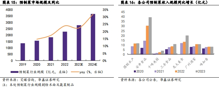 中游速冻企业扩充预制菜业务及传统预制菜厂商。传统速冻品后期冷冻保鲜环节与预制菜产业有重叠,同时经销渠道、团队等可实现复用,安井通过自产+并购+OEM三种方式开拓预制菜业务,但长期规模化、标准化的生产模式决定了其柔性定制产线相对较弱。以味知香为代表的传统预制菜厂商经过长期发展,形成较强专业能力,但门店模式辐射范围有限,C端零散化致使物流成本较高。