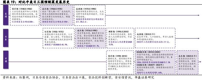 美日中预制菜依次起势,底层需求助力行业扩容。美国最早受益于工业化程度提升与人口密度增加,1950年人口增长推升餐饮需求,美式快餐巨头成立倒逼供应链标准化,行业销量复合增长率10%;与此同时日本外食餐饮发展、家电普及,同时由于本土资源匮乏,政府层面大力扶持速冻食品发展,1976年餐饮连锁化及降本增效需求催化B端预制菜起量,后续经济泡沫破裂,人口老龄化叠加家庭单位人口下降,C端接替发展;此时国内预制菜已经从起步迈向餐饮需求爆发,2020年疫情封控实现C端预制菜消费者教育。复盘中美日三国预制菜行业趋势,餐饮连锁化率提升构筑预制菜早期需求起势的底层需求,经济发展与人口结构调整助力家庭端预制菜消费提升。