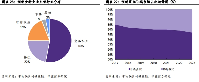 销售:包括经销、直销、加盟店、线上新零售等渠道,未来预制菜更多通过速冻、短保形式进入终端,渠道效率成为企业竞争核心,目前大部分企业以B端客户为主,C端预制菜消费者认知仍在培育中。