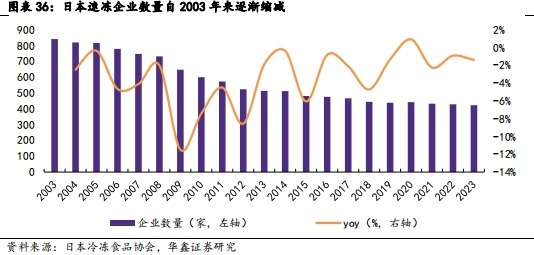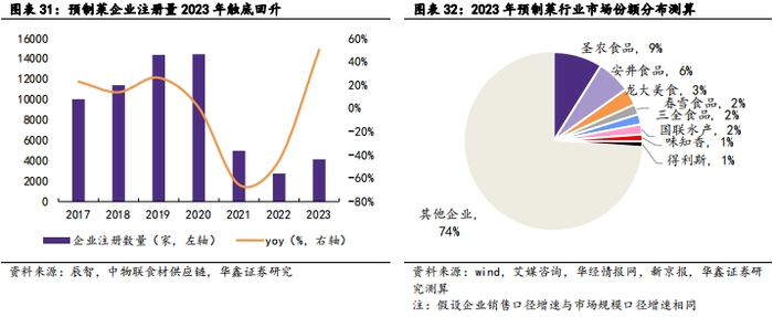 长尾企业疫情间显著出清,行业集中度仍有提升空间。我国预制菜企业注册量自2011年以来快速增长,由于预制菜产业准入门槛较低,企业规模整体偏小,注册资本小于200万元的企业占比50%以上,多承担代工厂任务,疫情期间预制菜行业规模提升而企业数量大幅降低,可见大部分低质长尾企业出清,2023年餐饮行情回暖带动企业数量回升。目前行业集中度仍低,根据测算,2023年我国预制菜行业CR5为22%,而日本行业的CR5已达64%,随着行业竞争加剧、政策环境趋严,我国预制食材行业集中度仍有较大提升空间。