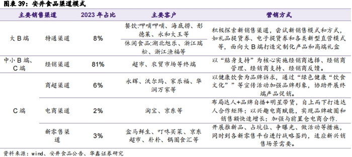 餐饮渠道为主,大客户资源稳固。公司采取以B端为主,C端为辅的渠道策略。1)餐饮端:公司通过组建专业服务团队快速响应客户需求,为大客户提供全生命周期管理服务,目前已为超过 200 家大型企业客户提供定制化产品服务,形成一批运营能力强、资金实力雄厚、对公司信赖度高的大客户资源,海底捞、肯德基、麦当劳等大型连锁餐饮客户奠定预制菜存量收入增长基础,同时公司以大B端客户为背书,借助产品性价比优势,通过经销商开拓中小B渠道,持续开发潜在中餐、快餐、西餐新客户拓展增量空间。2)C端:公司在优势区域市场持续开发网点,做渠道下沉,线上渠道依托京东、抖音、拼多多等平台增加品牌曝光度。