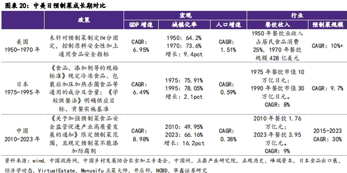 对比美日预制菜发展逻辑,中国预计仍有近10年成长期。通过对比美日预制菜发展路径,我们认为我国预制菜自2010年开始迈入预制菜成长期,且目前该阶段尚未结束,主要原因为:行业政策来看,我国预制菜概念传播较晚,舆论环境相对抵触,相较于美日预制菜多遵循通用食品安全法律,我国针对预制菜制定细分政策且不断更新迭代,随着配套监管政策出台,消费者担忧不断化解,C端增长阻力将不断降低。宏观经济来看,中国2010-2023年GDP复合增速8.98%,目前中国迈入发展新常态,预计GDP仍可保持中个位数稳健增速水平,2023年我国城镇化率为66.16%,相较于发达国家仍有增长空间,尽管人口增速有所放缓,但我国人口基数庞大,同时主力劳动及消费人群维持较好稳定性,为预制菜消费提供坚实支撑。行业发展来看,我国餐饮2010-2023年收入CAGR为9%,为B端预制菜需求存量稳定提供托底,同时餐饮连锁化率稳步提升,降本增效需求将进一步拉动预制菜增量需求的增长。