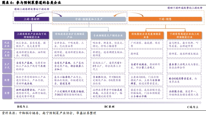 下游餐饮企业与零售商超向上游布局预制菜。部分大型连锁餐饮企业出于自身降本增效与保证口味稳定性的需求自建中央厨房,除内部供应净菜、半成品外,还可以企业品牌力为基础推出C端厨师菜品,尽管拥有C端基因,但销售渠道资源较为薄弱。零售商超企业以门店为核心,在销售渠道上具备天然优势,因此企业通过OEM模式进行轻资产布局,但品控与冷链建设导致前期成本投入风险较高。