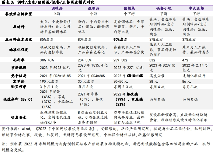 预制菜本质为食品工业化,在餐饮供应链中位于中下游。在餐饮供应链环节中,预制菜处于中下游位置,本质上依然是食品工业化,通过延长加工环节提高菜品完成度,狭义预制菜(速冻菜肴)可以看做复合调味品与基础速冻品的结合,在下游餐饮端应用上更为去厨师化;在商业模式上,从调味品、速冻品到预制菜再到餐饮,产品保质期逐渐缩短,供应链上游提供产品,下游提供服务,下游与消费者距离更近。在生产工艺上,由于预制菜涉及到的原材料种类较多,模块化较为困难,在清洗、切配等食材预处理环节与炒制等环节均需人工参与,相较于调味/速冻行业机械化程度相对较低,同时预制菜生产中原材料成本占比高于餐饮供应链上下游其他环节;在研发要求上,调味/速冻新品开发需要紧密跟踪消费者口味变化,根据前端热点趋势实现快速研发跟进,而预制菜以还原市场验证过的传统快餐/正餐菜品为主要诉求,研发难点在于克服口感与新鲜度问题。