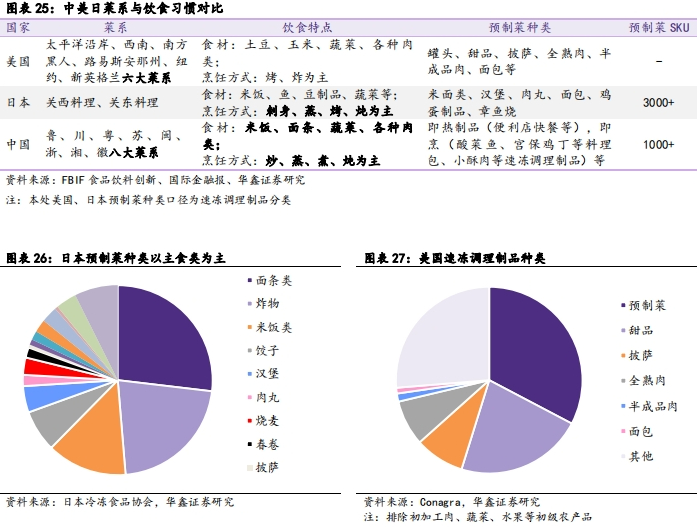 我国菜系复杂度较海外更高,预制菜品类仍有较大挖掘空间。从菜系来看,日本国土面积较小,可大体划分为关东料理与关西料理,美国人种结构复杂,共包含六大菜系,中国地域广阔、饮食习惯差 异大,共有八大菜系,菜品种类数量比美日更多。在饮食特点上,相较于美国以烤、炸为主的烹饪习惯,中国与日本在烹饪方式上较为相近,食材处理工艺更为复杂。目前中国预制菜sku数量仅1000余种,而菜系更少的日本则有超3000个sku,尽管国内预制菜口径较海外更窄,但国内仍存在部分菜系由于工艺问题尚未推广工业化,且除还原已经成熟的菜系外,我国预制菜在新菜品迭代能力上仍待加强,伴随产线升级与新口味挖掘,国内预制菜品仍有开拓空间。
