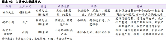 预制菜品类布局丰富,发挥协同作用提高效率。从“三路并进”的品类与渠道重点来看:1)OEM(冻品先生):定位川湘菜系和纯菜肴,主要包括成品菜、火锅周边、酒店菜,OEM贴牌模式有助于预制菜业务快速放量,公司通过经销商复用赋能冻品铺货推广,并持续迭代培育潜力单品,目前已成功打造酸菜鱼、香脆藕合等亿元大单品;2)自产(安井小厨):主要品类方向是以B端为主、BC兼顾的调理类、蒸炸类产品,通过自研自产提升产品利润率,增强对上游供应链把控程度,保障产品品质,目前已陆续推出小酥肉、荷香糯米鸡、炸霞糕等产品;3)并购(新宏业、新柳伍):公司收购新柳伍、新宏业布局小龙虾菜肴,旗下品牌包括柳伍水产和洪湖诱惑,在渠道上坚持虾尾聚焦B端,调味虾聚焦C端的策略,针对农贸市场、餐饮食材经销商及餐饮连锁店提供产品和服务,补齐公司预制菜品类与渠道版图。