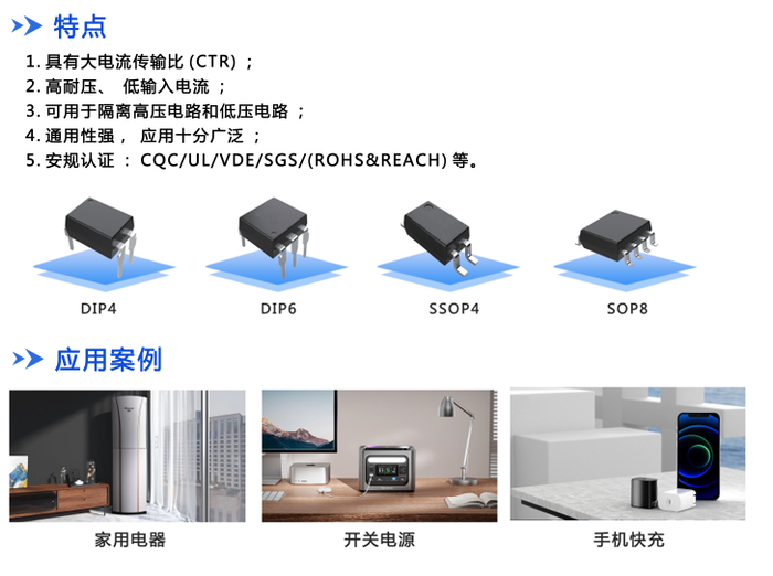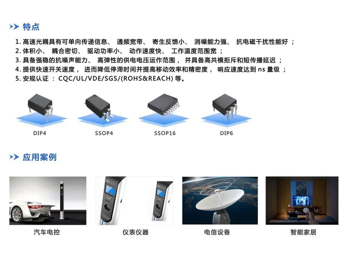 公司已通过ISO9001,ISO14001质量管理体系认证,公司对产品高研发投入及设计,现有产品已可PIN对PIN对标及兼容欧美、日、台资的多系列光电耦合器,产品均符合欧盟RoHS、REACH、SGS环保指令标准,并通过中国质量CQC,德国VDE,美国UL安规认证等多项国际认证。