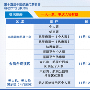 本届航展共开辟了珠海国际航展中心、金凤台观演区、中国航展无人机无人船演示区(斗门莲洲)三处观演区域,门票均采取限额销售的方式进行售票。三地限额分别为:珠海国际航展中心每天限量8万张(11月15日-17日)、金凤台观演区每天限量2万张(11月13日-17日)、中国航展无人机无人船演示区(斗门莲洲)每天限量1.5万张(11月12日-14日)。