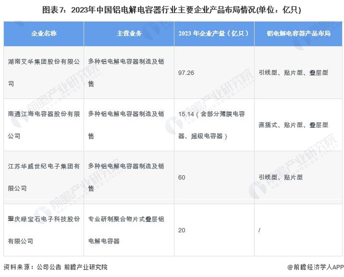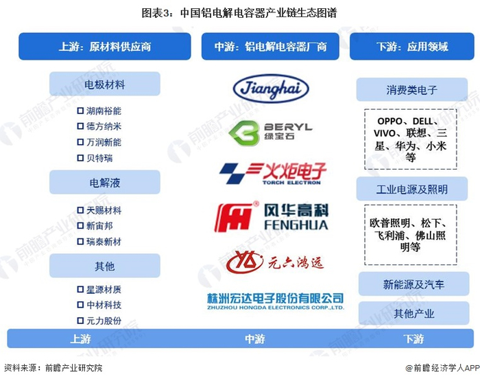 中游铝电解电容器生产商有艾华集团、江海股份、华威电子、东莞东阳光、绿宝石等企业。下游则是各类应用领域企业。